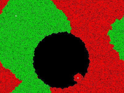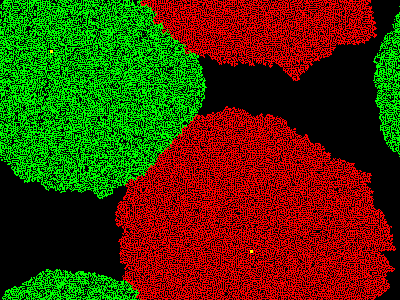 The 3x3 "castles" are treated as "always on" cells. I've written a small DOS program (will work fine under windows in full-screen) that will allow you to see in a compressed time scale how the two sides grow and spread. Since it doesn't have the weather system incorporated, you won't see as much variation, but it's still a good example. I wrote it as a "proof of concept" sort of thing, to test out the CA rules. It runs considerably faster than the online simulation for several reasons... 1) It's compiled into machine code, instead of running as interpreted Perl code, the latter of which is inefficient for maniuplating large arrays of numbers. 2) It uses a smaller map (320x200 instead of 400x300, and thus is only 53% as large). 3) The online version only does one iteration per team every 6 minutes as a cron task, to minimize impact on the other duties of the server. 4) It doesn't go back after every iteration to count population and collect other such data. Here's the program: